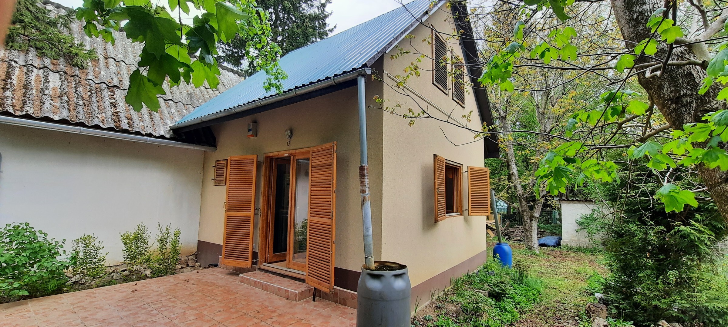 A telek egyik része már kerítéssel leválasztott, a másik részen könnyedén elszeparálható; mindkét telekrész saját mérőórával és fúrt kúttal rendelkezik. A kedélyesen lejtős telken gyönyörű diófák állnak, a patakhoz a megerősített támfal mentén lépcsősor vezet le. A kertben terméskővel kirakott autóbeálló van.